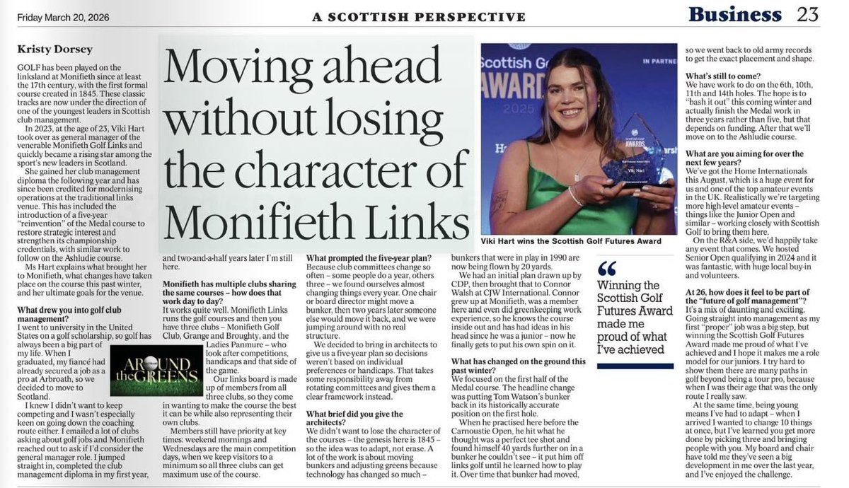 “The dedication and enthusiasm his team has shown—ensuring that Monifieth Links remains distinctive from its neighbours—has given us tremendous confidence in their work. They truly understand and value the unique course we offer.